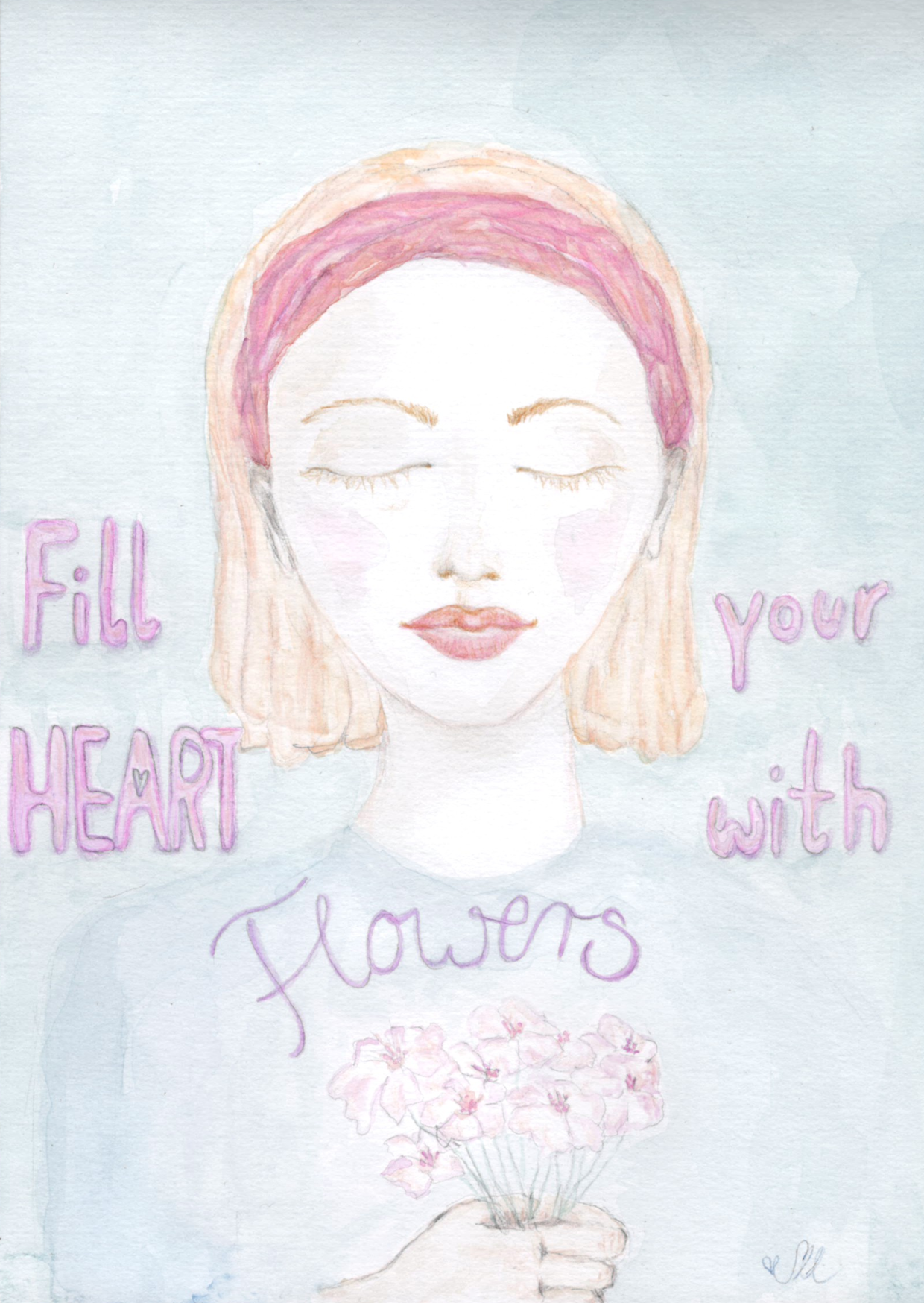 Diese besondere Postkarte ist ein Print meines handgemalten Originalbildes “Fill your heart with flowers” 2026: Aquarell und Aquarell-Buntstifte auf Papier